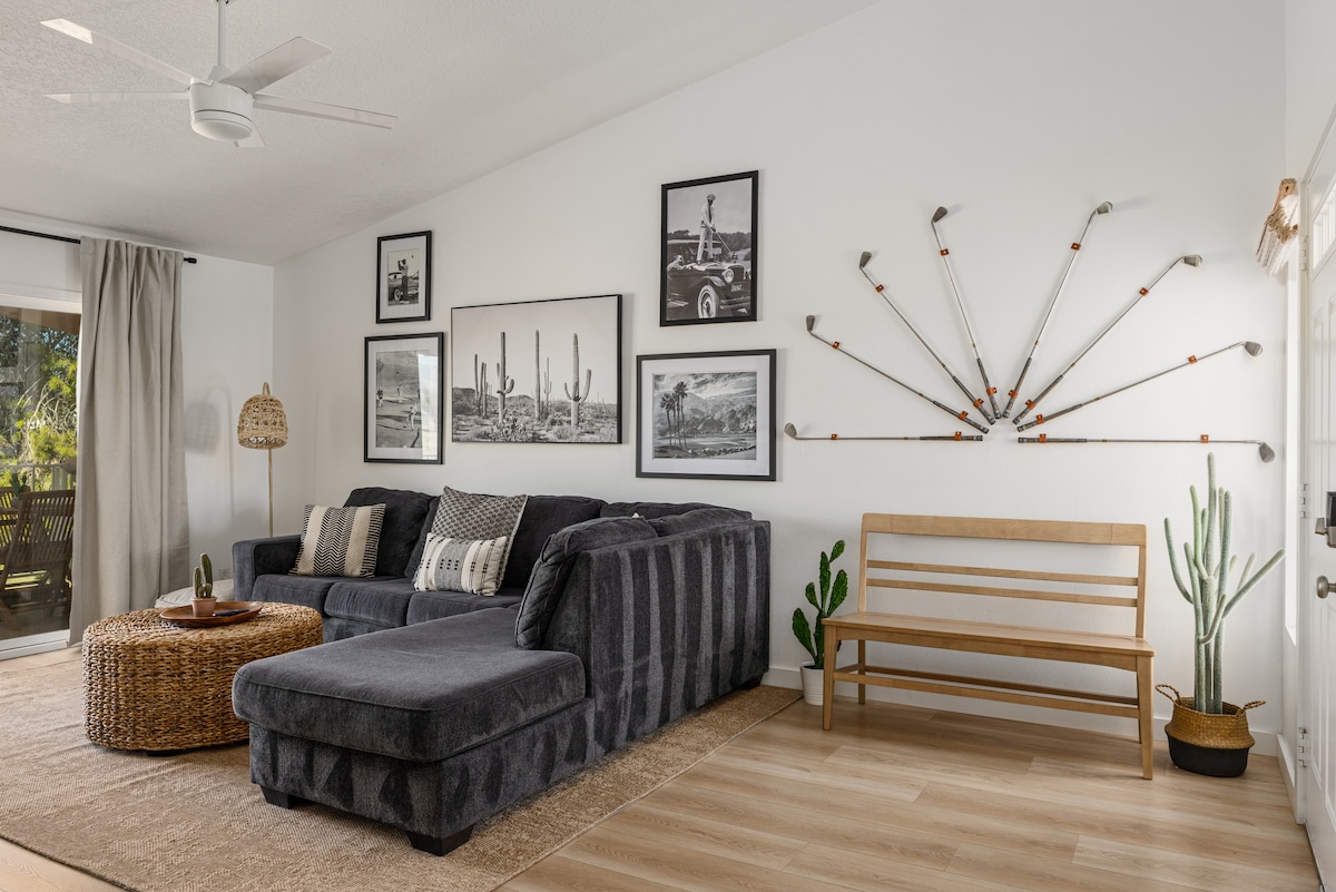Nossa suíte estúdio Legacy Palms com cama king size é um espaço recém-renovado, espaçoso e iluminado com uma vibe moderna do deserto da Califórnia. As portas francesas se abrem para uma varanda privada com vista para os exuberantes jardins da vila e fontes de água. A suíte dispõe de uma Smart TV com canais a cabo premium, frigobar, micro-ondas e cafeteira Keurig, juntamente com um banheiro privativo que tem uma banheira de imersão e chuveiro separado. Os terrenos da comunidade apresentam 12 piscinas aquecidas e spas, uma academia, redes, grelhas e muito mais!