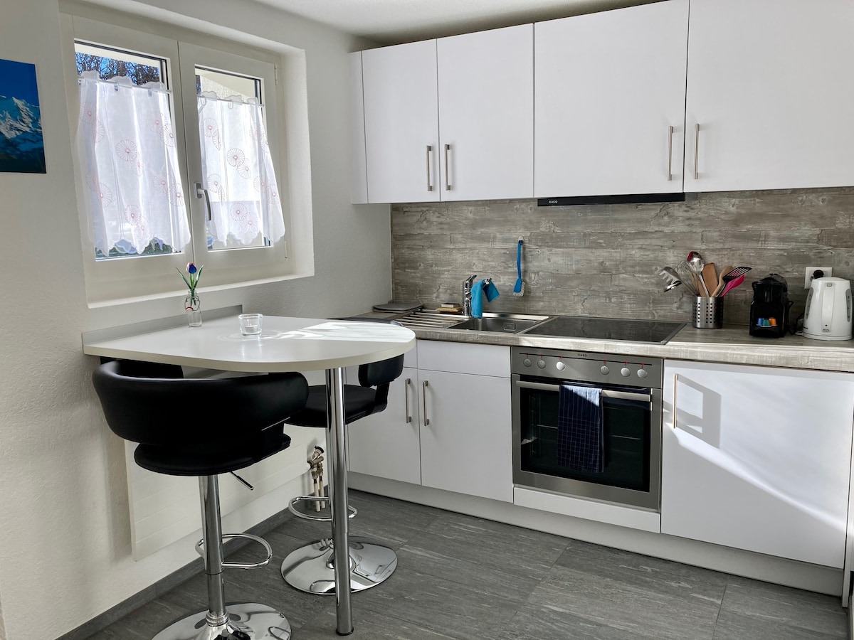 Um apartamento auto-suficiente de 2,5 quartos (1 cama king size, 1 cama queen size e 2 camas de solteiro), moderno, renovado em um antigo chalé suíço, com sua própria porta de acesso e uma área de estar no jardim sob uma antiga árvore bonita. Localizado a 5 min. a pé das lojas e a 10 min. do centro de Interlaken. O apartamento é mobiliado e decorado em um estilo luxuoso e confortável.