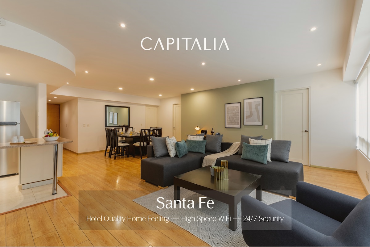 Apartamento completo cama KING size, banheiro e Wi-Fi sem fio. Bela vista de Santa Fé, sala de jantar, cozinha, micro-ondas, geladeira, máquina de lavar, ferro de passar. Estacionamento coberto com elevadores diretos. Segurança e vigilância 24h, academia Aqui você se sentirá em casa, um lugar muito acolhedor, com tudo o que você precisa para sua estadia. Mini supermercado em PB, 2 restaurantes internacionais e mexicanos. Ao lado de Santa Fé, muito perto de Interlimas, centros comerciais, Ibero, Tec, várias vias de acesso.