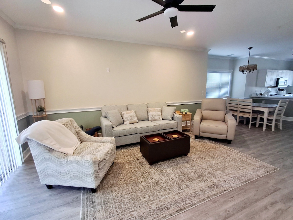 Newly renovated 2 BR, 2 Bath ground floor unit at True Blue Resort. Master has king bed, 2nd bedroom has twins. The hall bath has a walk in shower. TVs in every room with digital cable and free WiFi. Fully stocked kitchen. Screen porch with seating and pool within walking distance. 5 minutes to beach. All linens provided. Small pets welcome with additional $50 cleaning fee. No rvs ,trailers, boats or motorcycles are allowed on resort