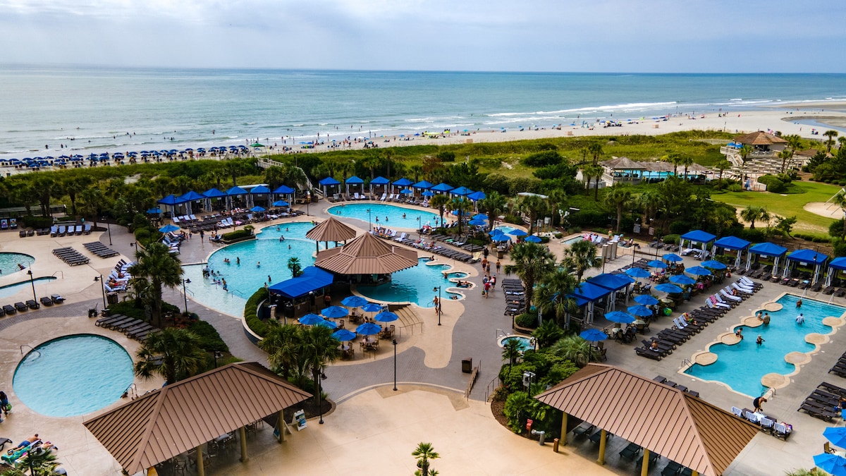 Vila de férias de luxo em North Beach Resort & Villas, North Myrtle Beach. 60 Acres Oceanfront Bliss with Soft White Sand Beach, água salgada refrescante aquecida pela Corrente do Golfo e o sol durante todo o ano. 2,5 acres de comodidades de piscina com tema caribenho com várias piscinas, grande espaço para banhos de sol, cabanas pessoais com serviço de mordomo, banheiras de hidromassagem e um bar de banho. O Grand Strands Only Swim-Up Bar! Nade o ano todo no Complexo de Piscinas Interiores com um Rio Preguiçoso.