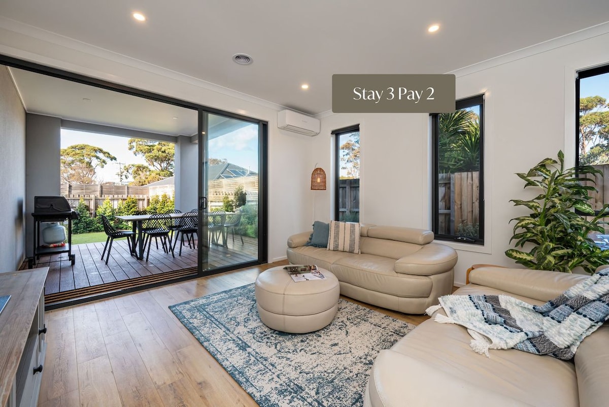 WE’RE BACK! After a break from hosting we’re back and better than ever! Our newly constructed, spacious 3 bedroom, 2.5 bathroom home is the perfect base for your Inverloch adventures! In addition to all the amenities you need for a relaxing getaway we also boast location, location, location! You can leave the car in the garage throughout your stay because we’re only a 250m walk to the cafes, restaurants and shops in the centre of town and just a short 750m stroll to the inlet beach.