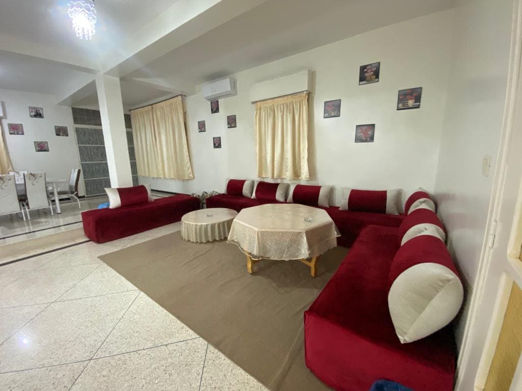 Bem-vindo à nossa vila no térreo, localizada em um bairro muito bom, tranquilo e bem localizado. Localização ideal: 15 min da praia, Souk El Had, ao lado do Palais Royal, perto de Marjane, e souk local a 2 min a pé. A vila tem 2 quartos (um master e um com camas separadas/beliches), uma grande sala de estar tradicional em estilo riad, Smart TV com IPTV, Wi-Fi de fibra óptica, acesso ao jardim e hammam beldi. Um lugar acolhedor para se sentir em casa 🌿