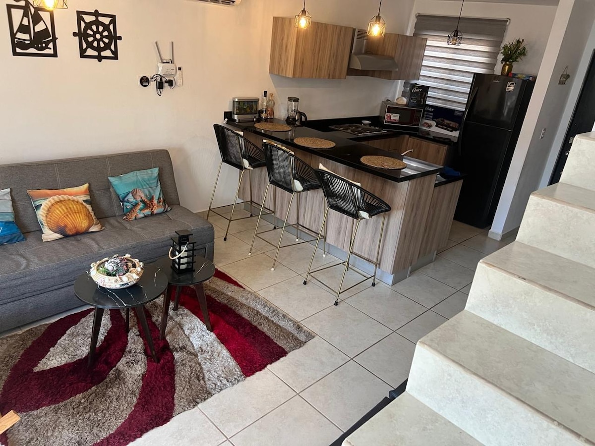 Punta Paraiso é um complexo de apartamentos localizado a poucos passos da praia em Nuevo Altata, cercado pela natureza. Este lugar é ideal para escapadas românticas ou simplesmente para desfrutar de um espaço familiar e agradável O apartamento fica no térreo (sem escadas) e na torre localizada acima da avenida principal. Desfrute deste paraíso enquanto pratica ioga, desfruta da vista no terraço, nada na piscina ou simplesmente descansa. Nosso lugar foi mobiliado com amor e cuidado.