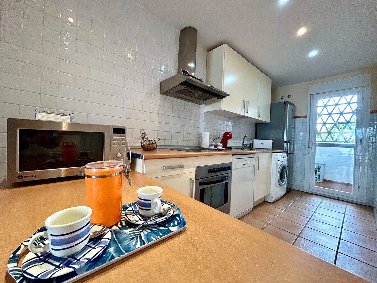 Casa tranquila no Islantilla Golf Resort, perfeita para famílias, com piscina, ar condicionado, terraço muito grande, quadras de remo e tênis, parque, lago e muito mais! Ele também tem bar/restaurante com peixe frito e outras refeições típicas (aberto apenas na temporada de verão). A praia fica a cerca de 15 minutos a pé, embora seja preferível ir de carro ou trem 🚂 que para bem no empreendimento e desce até a praia, shopping center e área do hotel.