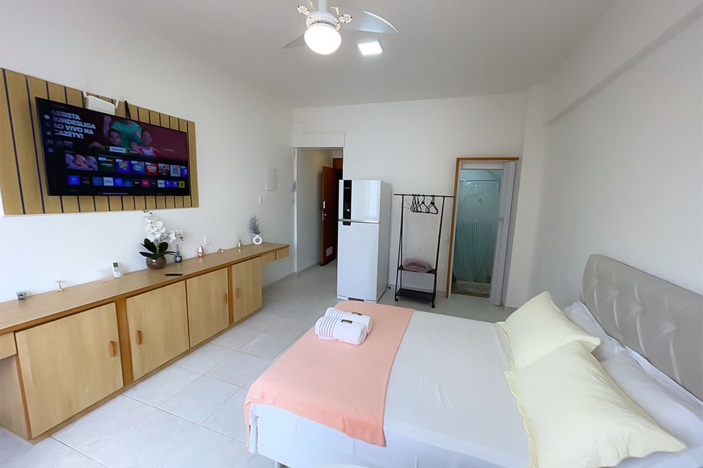 Sobre o imóvel: - Studio com 25m² e fica localizado a 5 minutos de carro da praia e a 2 min do Centro Comercial (BARROCO); - Garagem privativa; - Acomoda confortavelmente até 3 pessoas; - Varanda espaçosa . Destaques: - Cozinha equipada com cooktop por indução duas bocas, forno elétrico, microondas, air fryer, sanduicheira, cafeteira dolce gusto, cafeteira elétrica e liquidificador. - Wi-fi de alta velocidade; - Ar condicionado; - Ventilador de teto; - Smart TV.