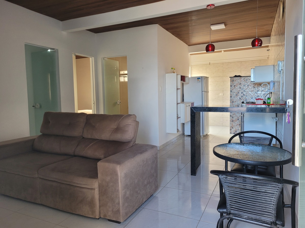 Apartamento térreo em prédio tranquilo e familiar, bem localizado, perto de mercados, padarias, bares e restaurantes, próximo ao centro, com total segurança e comodidade. O local possui 2 quartos (1 com ar-condicionado), 1 banheiro, sala, cozinha, varanda espaçosa, área de serviço ampla e vaga de garagem. O apartamento está totalmente mobiliado e equipado, aguardando somente a sua hospedagem! Qualquer dúvida, favor entrar em contato.