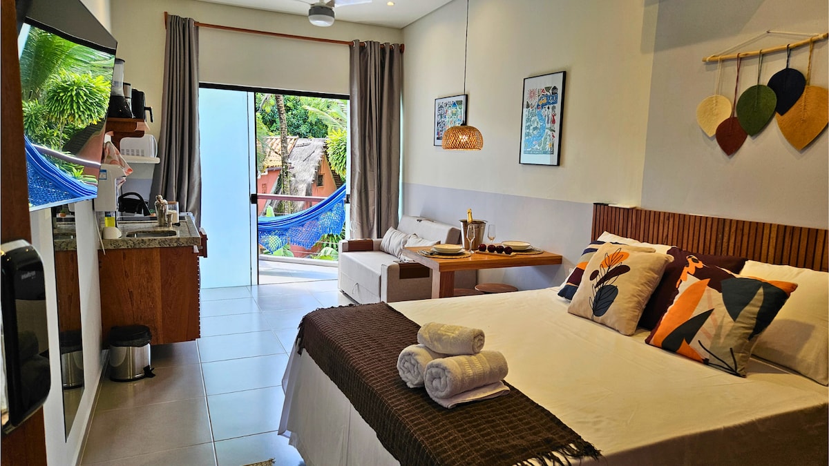 Com excelente localização, esse espaço pode ser descrito como um refúgio no coração de Itacaré. O studio conta com varanda privativa, cozinha de apoio, cama queen size, em um ambiente arejado - tudo pensado para a praticidade e o conforto dos hóspedes. Apesar de central, a região é muito tranquila. Silêncio, segurança e boa vizinhança estão presentes.