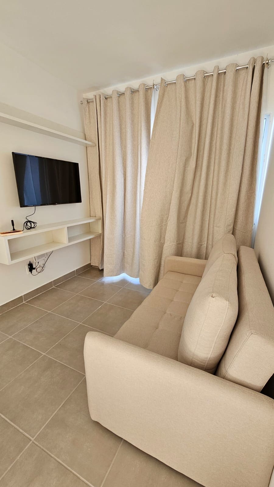 Apartamento composto por sala integrada com a cozinha, 1 (uma) suíte, 1 (um) quarto, banheiro social, varanda e área de serviço. Comporta até 6 pessoas. Dispõem de 2 (duas) camas de casal e 2 (dois) colchões de solteiro, ares-condicionados em cada quarto, lençóis, toalhas, acesso Wi-Fi, televisão, sofá, geladeira, fogão, mesa e utensílios de cozinha. Além disso, possui uma vaga de estacionamento, guarita 24 horas, churrasqueira (mediante reserva e pagamento de taxa).