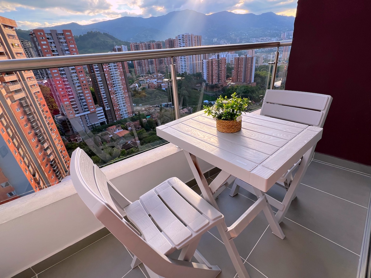 **IMPORTANTE! LEIA AS REGRAS DA CASA PRIMEIRO** Fuja para o nosso luxuoso apartamento de 21º andar, 2 camas, 2,5 banheiros com vistas deslumbrantes de Envigado e Medellín. Este retiro recém-renovado e adequado para animais de estimação acomoda confortavelmente 4 hóspedes. Desfrute de uma varanda privativa, cozinha moderna e comodidades do edifício, como banheira de hidromassagem no terraço e academia. Perfeitamente localizado a poucos passos do Shopping Viva Envigado, é uma base ideal para explorar a cidade. Estacionamento gratuito incluído.