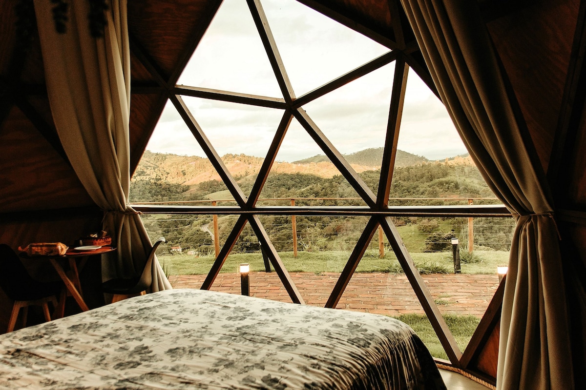Com vista privilegiada para a Serra da Mantiqueira, nosso chalé oferece uma experiência única de conforto e contemplação. Localizado a 1 km do centro de Jacutinga–MG, está na rota das principais vinícolas das Serras Vulcânicas e a 40 minutos de Espírito Santo do Pinhal–SP. Pensado para o seu bem-estar, o chalé conta com cortinas blackout, ar-condicionado quente e frio, lareira e uma confortável cama king size. A banheira com hidromassagem e água aquecida garante momentos de puro relaxamento.