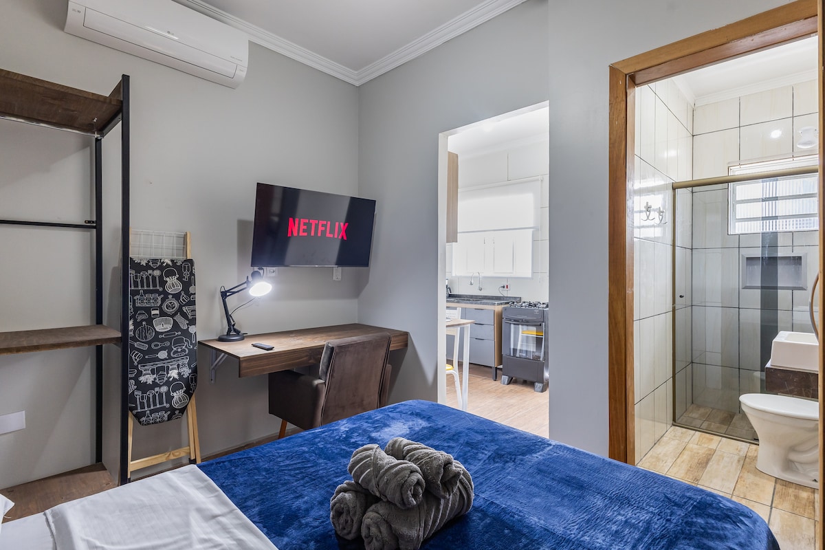 Ambiente moderno e novo,para pessoas exigentes que buscam conforto e tranquilidade durante sua hospedagem . Espaço ideal para descanso e homework. Studio conta com internet fibra , Smart TV , aquecimento a gás para banho e cozinha, geladeira, microondas, cooktop, forno elétrico, cafeteira, sanduicheira,passadeira a vapor portátil, depurador de ar, cama, sofá, mesa para homework, persianas e lava e seca . O Studio ainda conta com todo enxoval de cama e banho e utensílios domésticos.