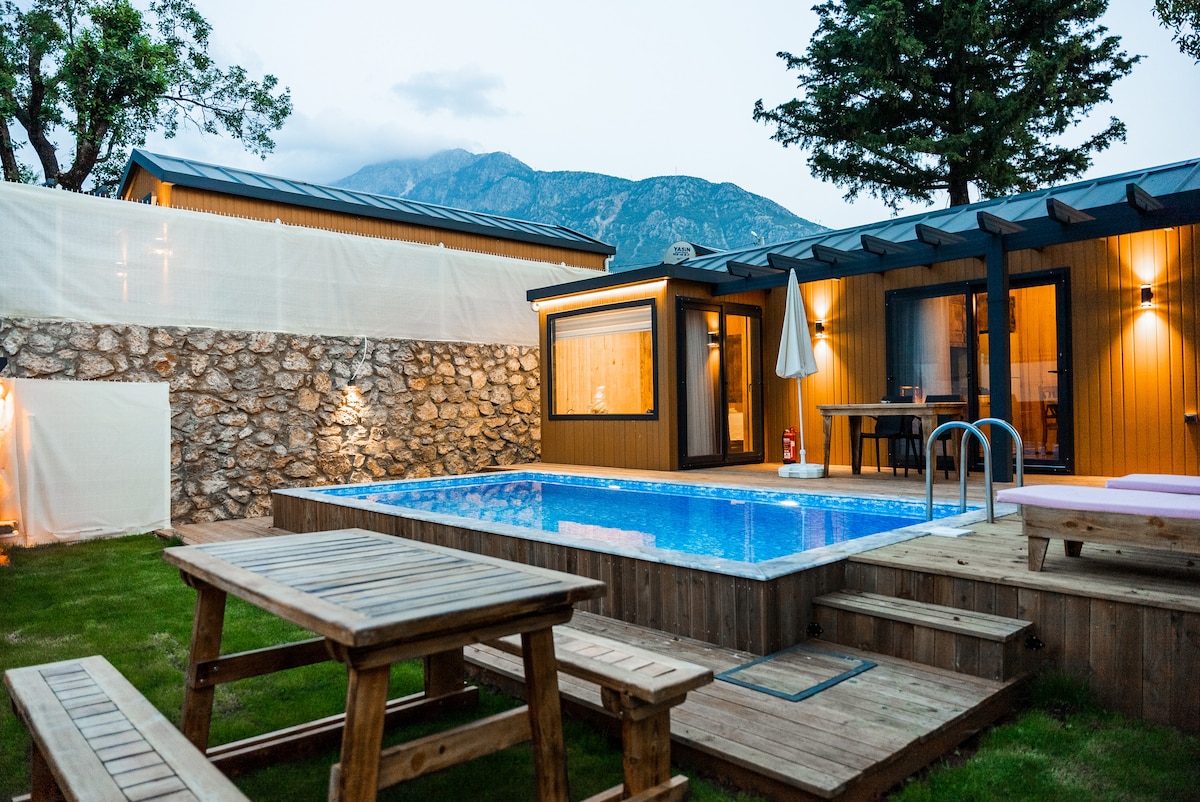 um quarto para duas pessoas bangalô. com piscina própria. excelente localização em oludeniz. lojas e restaurantes estão a 50 metros do bangalô. a uma curta distância a pé de migros.