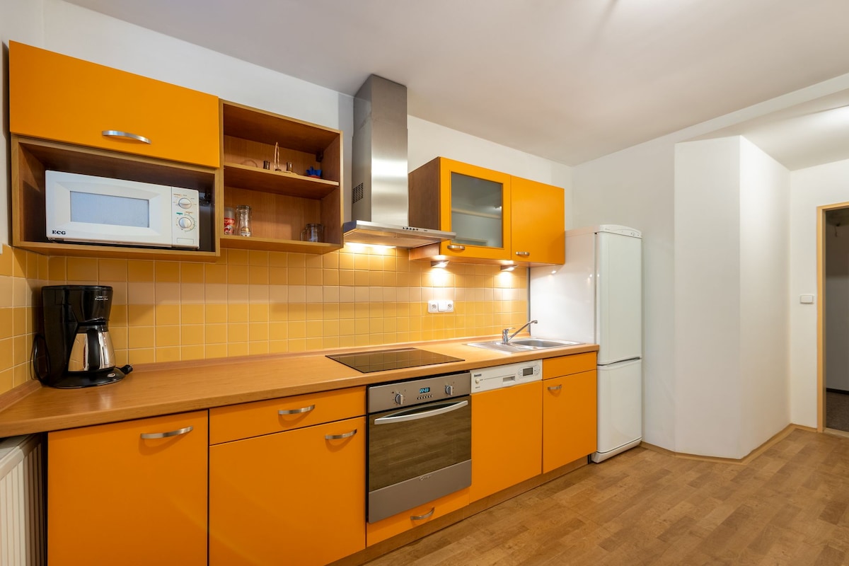 Apartamento com uma área total de aprox. 39 m2 com seu próprio jardim da frente, localizado na área fechada Residente Harrachov. Há uma cama de casal, um beliche e um sofá-cama para 4 pessoas dormirem confortavelmente. Kitchenette equipada, banheiro e roupeiros embutidos. O estacionamento é fornecido em seu próprio lugar de estacionamento.