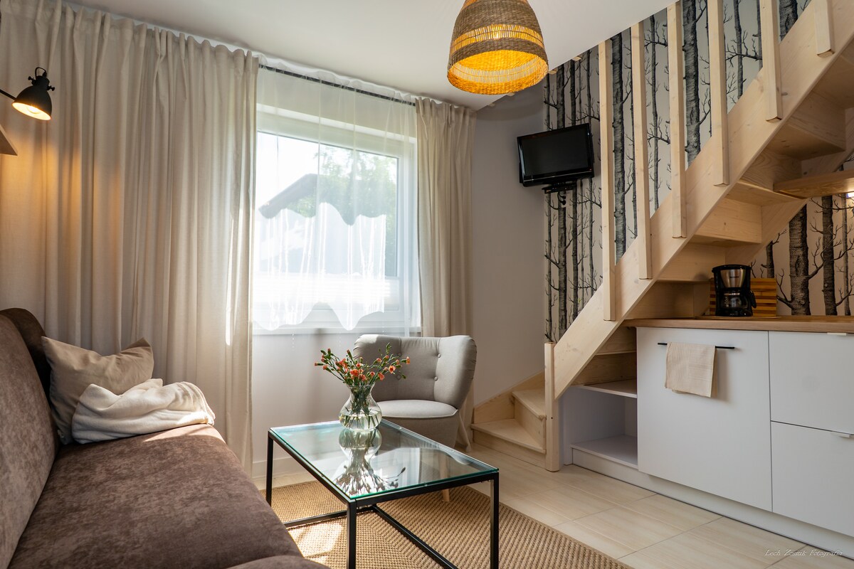 Uma casa de madeira em estilo moderno, que inclui: - Sala de estar espaçosa com TV, canto, mesa de jantar - kitchenette moderna e prática - um quarto com uma cama de casal - banheiro com chuveiro, pia e WC - terraço - sauna ao ar livre (custo extra) - Piscina (julho-agosto) A área está cercada por árvores altas, e há apenas 2 propriedades no terreno, o que proporciona privacidade e descanso em silêncio. [Um depósito de segurança reembolsável de 500zł é cobrado no dia da chegada.]