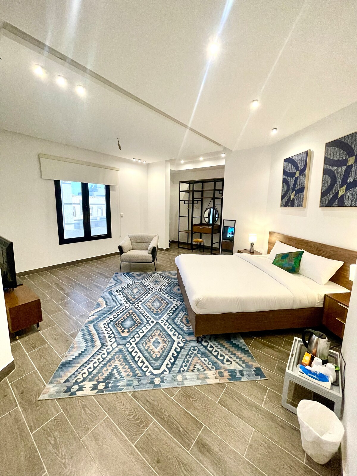Este espaço é caracterizado pela tranquilidade, design moderno e tecnologia moderna. O quarto também possui iluminação tranquila, pincéis de hotel de luxo e atenção aos melhores detalhes de limpeza, serviço de quarto e recepção disponíveis durante toda a hora,,, proximidade do hotel com serviços como(supermercado,restaurantes, shopping, lavanderia, mesquita, padaria e muito mais), além de equipe de recepção exigente em como servir o hóspede e conhecer desejos, o quarto tem uma máquina de lavar roupa, um cofre, uma tela de smart tv e um ferro de passar roupa.