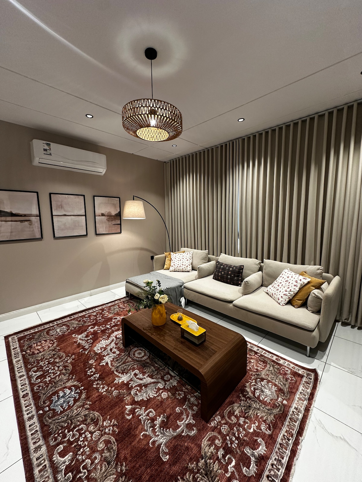 Our stylish and modern apartment is located in the heart of the city, just around 12-minutes drive from the airport and RedSea. You'll find yourself surrounded by restaurants, markets, and entertainment. The apartment features a spacious living area with a new 75-inch LG smart TV with Netflix and Shahid VIP. In the mornings, wake up to a cup of coffee from our Nespresso machine. Throughout ou'll enjoy luxurious furnishings and thoughtful decor that creates a cozy yet refined ambiance.