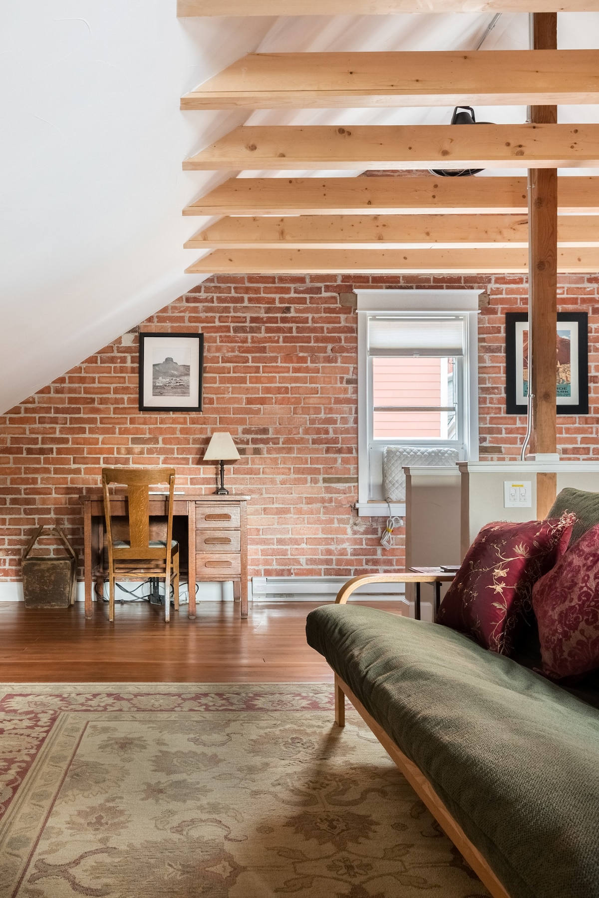 Escolha um livro de uma prateleira e aconchegue-se na cama para uma boa leitura. Este espaço amplo no nível superior de uma casa de transporte possui muitas comodidades modernas, mas manteve muitas características originais com paredes de tijolos expostos e vigas de teto. Número de licença de aluguel de curta duração da Cidade de Golden: STR-STR-25-33 A ocupação da unidade é limitada a quatro adultos e seus dependentes.