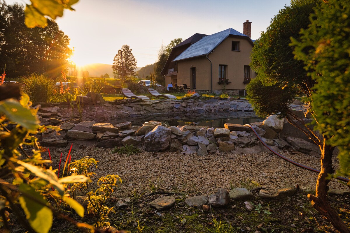 Chalé de bem-estar NaHory - Zlaté Hory - piscina, sauna e banheira de hidromassagem. O Chalé NaHory é uma casa de campo equipada e muito atraente acima do padrão, localizada na parte superior da aldeia de Ondřejovice. Se você quiser experimentar umas férias onde você não vai perder nada, esta casa é para você. A piscina ao ar livre, a banheira de hidromassagem e a sauna finlandesa tornarão suas férias uma experiência inesquecível. Ao estar em um grande terreno de quase 5000 m2, você tem a garantia de privacidade imperturbável. A casa é cercada por vegetação e árvores.