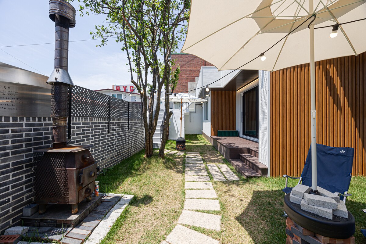 Acima de tudo, é o maior atrativo desta acomodação poder desfrutar de um churrasco no centro da cidade. O terraço está localizado bem na frente da sala de estar, então há um espaço onde você pode relaxar e tomar uma xícara de chá em silêncio. É uma acomodação divertida para assistir filmes no sótão com um projetor. É um espaço de pouco mais de 79m², então é espaçoso o suficiente para 2 pessoas. Se você gosta de plantas, também poderá sentir a sensação de estar em meio a um jardim. Se você caminhar cerca de 2 minutos do alojamento, é bom passear pela praia e há um local de aluguel de bicicletas operado pela cidade, então é recomendável andar de bicicleta na floresta de juncos. Se você for até a aldeia Hanok, poderá devolvê-la lá. A cerca de 10 minutos a pé, há também o Deokjin Park, que é famoso por ser um ponto turístico noturno. Acho que o mais importante em qualquer viagem é ter um alojamento aconchegante e confortável e que seja limpo. Prepararemos tudo para que você possa se sentir em casa. O custo do churrasco é de 20.000 wones, e fornecemos carvão, grelha, tocha, papel alumínio, etc.