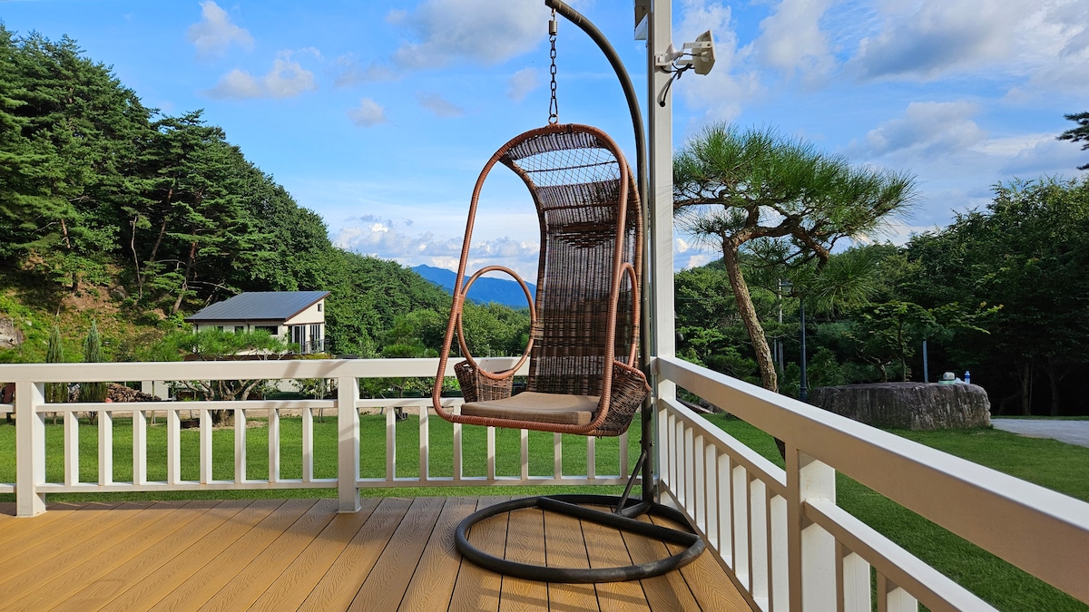 Agora. Aqui. Um espaço para você que só quer descansar em um lugar bonito. Se você vier para Jeonju, o descanso está aqui. A 30 minutos de carro da Vila Hanok. Desfrute de um descanso completo em uma acomodação elegante cercada pela natureza que lembra Zalsburg. Apenas um grupo por dia pode desfrutar da bela paisagem e jardins. Atrás de você, a montanha Yubongsan, e no futuro, uma bela vista para o jardim com dois lagos está localizada no maravilhoso e antigo Haenggungter. Wibongsa, Yubongsanseong e Wibong Falls ficam a 10 minutos a pé, e há muitos lugares para desfrutar e ver nas proximidades, incluindo passeios fantásticos. Churrasqueira ao ar livre disponível. O custo de usar carvão e grelha é de 20.000 won. (Se a água externa estiver congelada no inverno e for difícil limpar a grelha, pode ser difícil fazer churrasco.) Se você apenas trouxer lenha, também pode desfrutar da fogueira. Grelhar carne ou peixe (incluindo camarão, etc.) não pode ser feito dentro de casa. É possível fazer Tangyu. Agradecemos sua cooperação