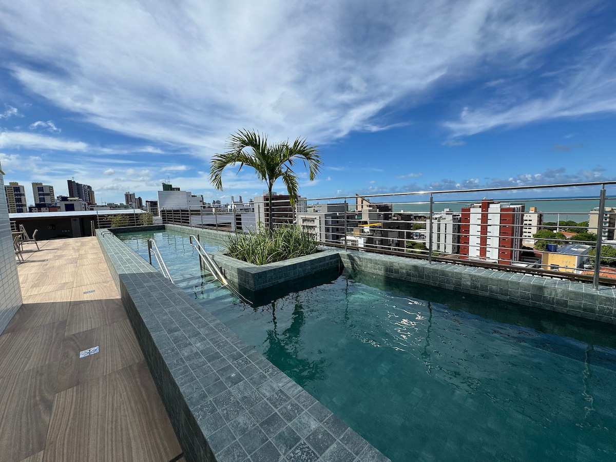Apto novo de 44m² a 50m do mar do Cabo Branco. Jacuzzi privativa (sem aquecimento), banheiro amplo, no pavimento térreo, sem escadas. Na cobertura: piscina com borda infinita e jacuzzi aquecida, ambas com vista para o mar. Inclui enxoval completo, cama auxiliar, ar-condicionado, louça, SmartTV, frigobar e cafeteira Nespresso. O prédio oferece co-working, Wi-Fi, academia, recepção 24h, garagem rotativa e café da manhã com buffet livre (pago à parte no local).