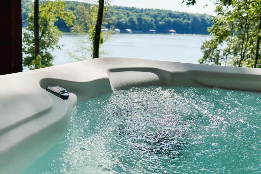 Casa de madeira com 5 quartos, banheira de hidromassagem e doca no lago