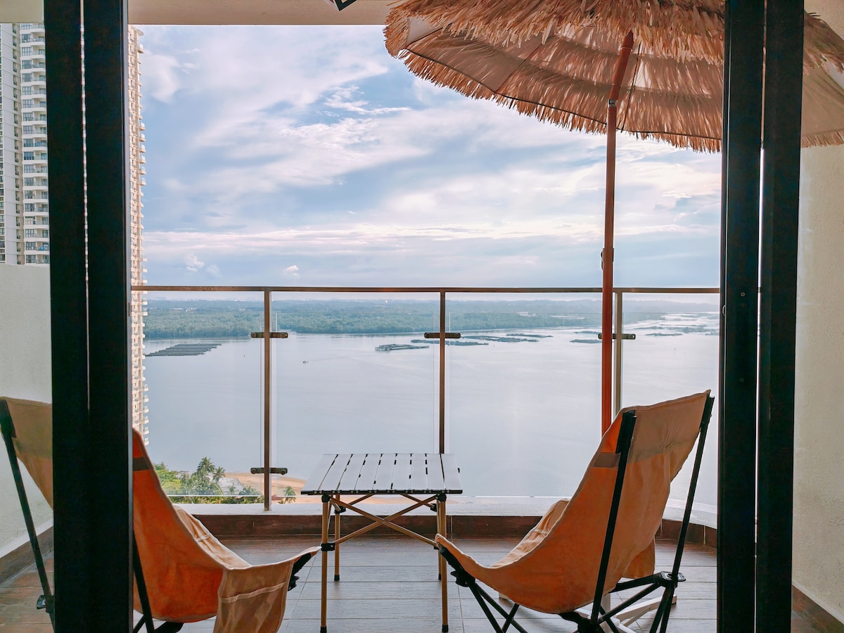 Fantástica vista para o mar★ no 40º andar! ★ 99% igual às fotos! Vista ★ magnífica do pôr do sol! ★ Balanço legal, pula-pula e tenda para crianças! ★ Jogo de mahjong TV de★ 50" com Netflix, Disney+, HBO e mais de 50 canais ★ Limpeza impecável e boa higiene! ★ Acesso fácil à praia ★ 5 minutos a pé do shopping Beletime Danga Bay com supermercado Aeon Ambiente ★ ventoso e relaxante, com muitos restaurantes e entretenimentos à sua porta, adequado para passeios com amigos e famílias!