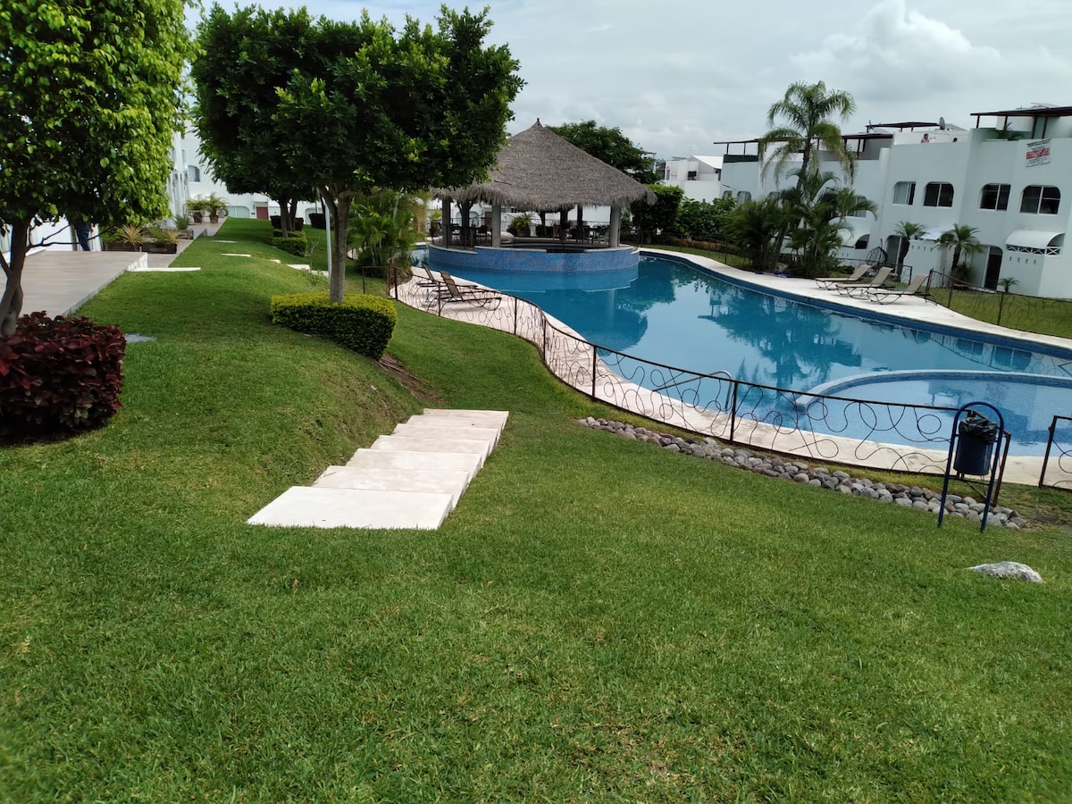 Desfrute de sua própria piscina aquecida privativa e uma jacuzzi, ideal para relaxar em privacidade, 3 quartos e uma sala de estar com TV e ar condicionado, terraço e jardim no telhado, cozinha equipada, trampolim. Grande piscina com piscina infantil e palapa, onde você pode se divertir, a Aquazona com escorregadores e jogos aquáticos, a 10 minutos de distância estão clubes de praia e praias do Lago Tequesquitengo, as fontes termais de Las Huertas e Los Manantiales, vá para El Rollo, Las Estacas e Jardines de México, ambos a 10 minutos de distância