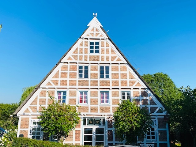 Desfrute do charme especial de uma fazenda de 200 anos coberta de palha, uma das mais belas casas de madeira da cidade. Você é recebido por um antigo estábulo, agora um corredor com uma atmosfera especial: aqui você encontrará o pequeno e elegante apartamento, aninhado em um belo conjunto natural. Esta casa ficou conhecida quando a famosa atriz Elisabeth Flickenschildt quis realizar seu sonho de ser uma fazendeira no campo em 1976, mas faleceu em 1977.