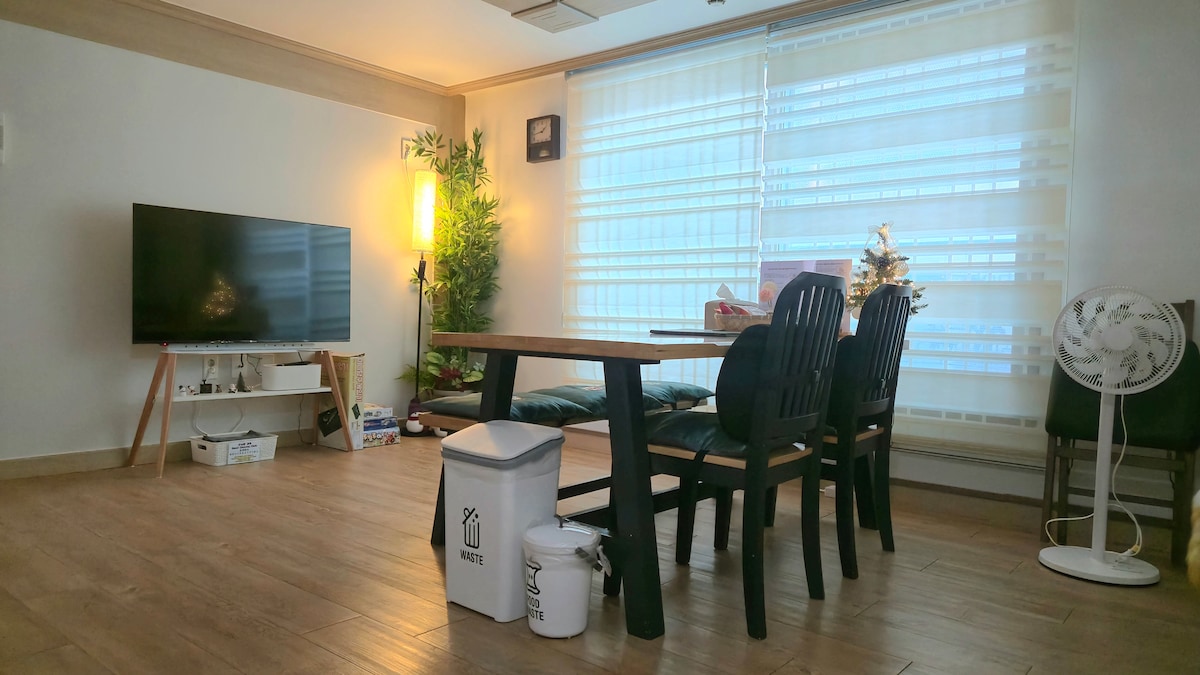 Relaxe com toda a família neste retiro tranquilo. Estádio de Beisebol Daejeon (5 minutos a pé), Catedral do Sagrado Coração (7 minutos de carro) Bomunsan (Aquário Daejeon a 5 minutos de carro), Estação Daejeon (9 minutos de carro) Localizado e Perto de Sikjangsan Observatory, Chungnam National University Hospital, Há O World em Daejeon. Nossa casa conta com 2 quartos, São dois colchões queen. Nossa ocupação padrão é 2. (É um espaço adequado para 4 pessoas ficarem.) Uma mesa de jantar e cadeiras para 5 pessoas comerem confortavelmente são fornecidas. Apenas um quarto (cama queen) pode ser usado para 2 pessoas. Outro quarto está disponível para 3 a 4 pessoas. Toppers e roupas de cama (1 pessoa) são fornecidos para 5 pessoas. * Depósito de bagagem disponível antes de entrar no quarto. * Check-in tardio também é possível. (Senha fornecida com antecedência)