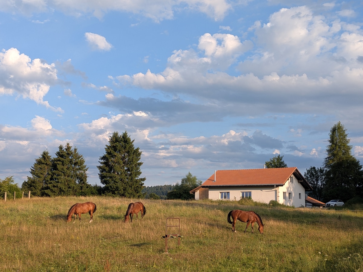 Oferecemos um apartamento tranquilo e espaçoso no último andar do prédio com uma bela vista da natureza. Nossa fazenda "la Belle Etoile" está localizada a quase 1000 metros acima do nível do mar no cantão de Jura e é ideal para pessoas que procuram relaxar, bem como para famílias com crianças. A área é ideal para caminhadas e ciclismo. Teremos o maior prazer em permitir que você tenha uma visão geral da nossa vida na fazenda e com nossos animais