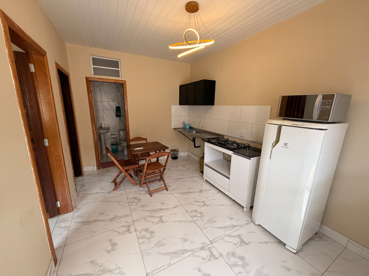 Kitnet mobiliada com garagem, localizado na avenida Londrina, próximo ao redondo do módulo 05. Possui 3 camas, sendo duas de casal e 1 de solteiro, fogão, geladeira, máquina de lavar roupas, chuveiro elétrico, cozinha... Em um dos quartos tem Ar condicionado e no outro ventilador.
