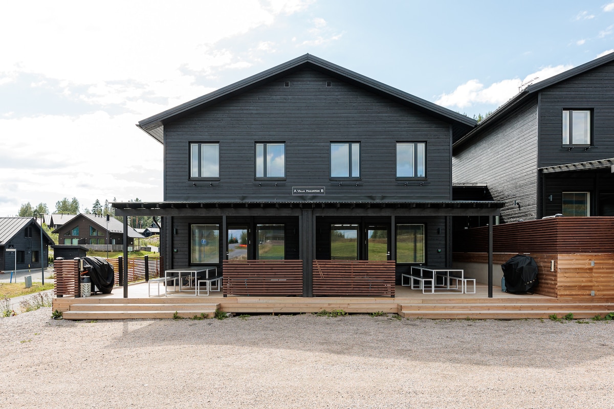Localizada em uma nova área de casas de campo, esta villa geminada oferece acomodações de qualidade para dez (9+1) pessoas. O lugar é ótimo para férias em família, grupos de amigos e um espaço para festas. A vila está localizada no meio de Himo, você pode caminhar até as pistas, o campo de golfe, a loja, a Himos Areena, o distrito de Festari e o Centro de Diversões Will para o Oeste. Depois da sauna a vapor, você pode dar um mergulho na banheira de hidromassagem ao ar livre. A banheira de hidromassagem e as roupas de cama não estão incluídas. Custos adicionais: Banheira de hidromassagem € 190/reserva. Conjunto de roupa de cama € 22/conjunto.