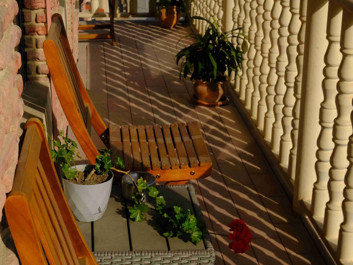 Schöner Ausblick auf die Stadt Sighnaghi und den Kaukasus. Genießen Sie Ihren Abend auf dem Balkon mit einem Glas Wein.