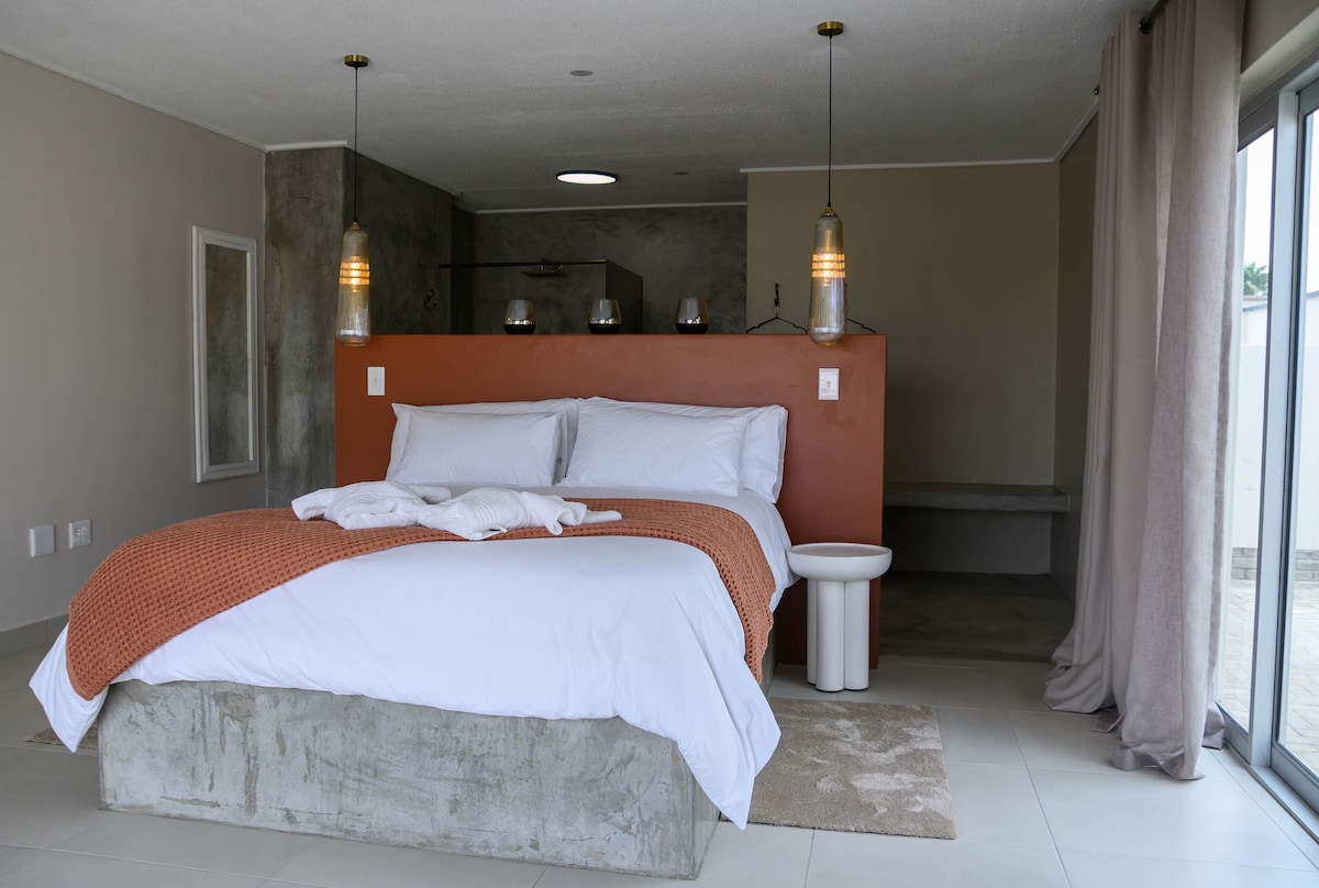 Este quarto apresenta uma decoração única num estilo moderno e elegante com peças de decoração de madeira feitas por medida e obras de arte do artista Aileen Taljaard. Os interiores frescos dos nossos quartos estão equipados com uma televisão LCD, acesso Wi-Fi gratuito e uma casa de banho moderna. As comodidades adicionais da nossa propriedade incluem uma piscina cintilante onde os hóspedes podem relaxar com uma bebida refrescante numa das nossas espreguiçadeiras. Nossas características de água melhoram ainda mais o clima de tranquilidade no The Maxton.