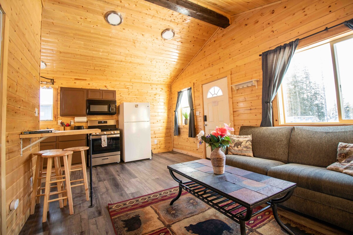 Pretendemos fornecer um ambiente sereno para que você possa desfrutar dos muitos esplendores que o Alasca oferece. Vamos além para proporcionar uma experiência de 5 estrelas para tornar este o seu lar longe de casa. Nossas cabines estão totalmente mobiliadas, incluindo lavanderia, forno/fogão, geladeira, aparelhos de DVD, churrasqueiras e muito mais.