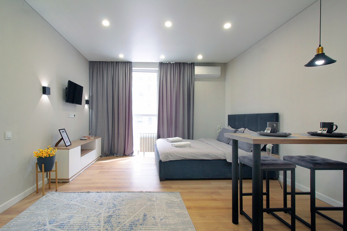 Welcome to your ideal stay in Almaty! Enjoy breathtaking mountain and city views right from your window. -7 minutes to Metro Station -сomfortable bed and cozy sofa -fully equipped kitchen -modern bathroom with fresh towels and toiletries - Wi-Fi and SmartTV The apartment is located in a safe and lively district, close to cafés, supermarkets, pharmacies, shopping malls! Self-check-in available Always ready to assist you — feel free to message any time. Relax, explore, feel at home!