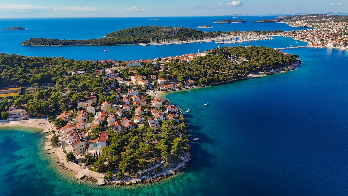 Luxury Seafront Penthouse with Rooftop Terrace and breathtaking 360 panoramic sea view, jacuzzi, bar and sunbathing area, in the heart of Murter. Spread on two floors, consists of spacious executive suite with balcony and a Rooftop Terrace(additional booking needed) above. Everything is within walking distance like finest local restaurants. Marina at your doorstep and Hramina bay archipelago in the palm of your hand. Perfect getaway for two. 7 minutes drive from Garden Tisno. Enjoy the sunset!