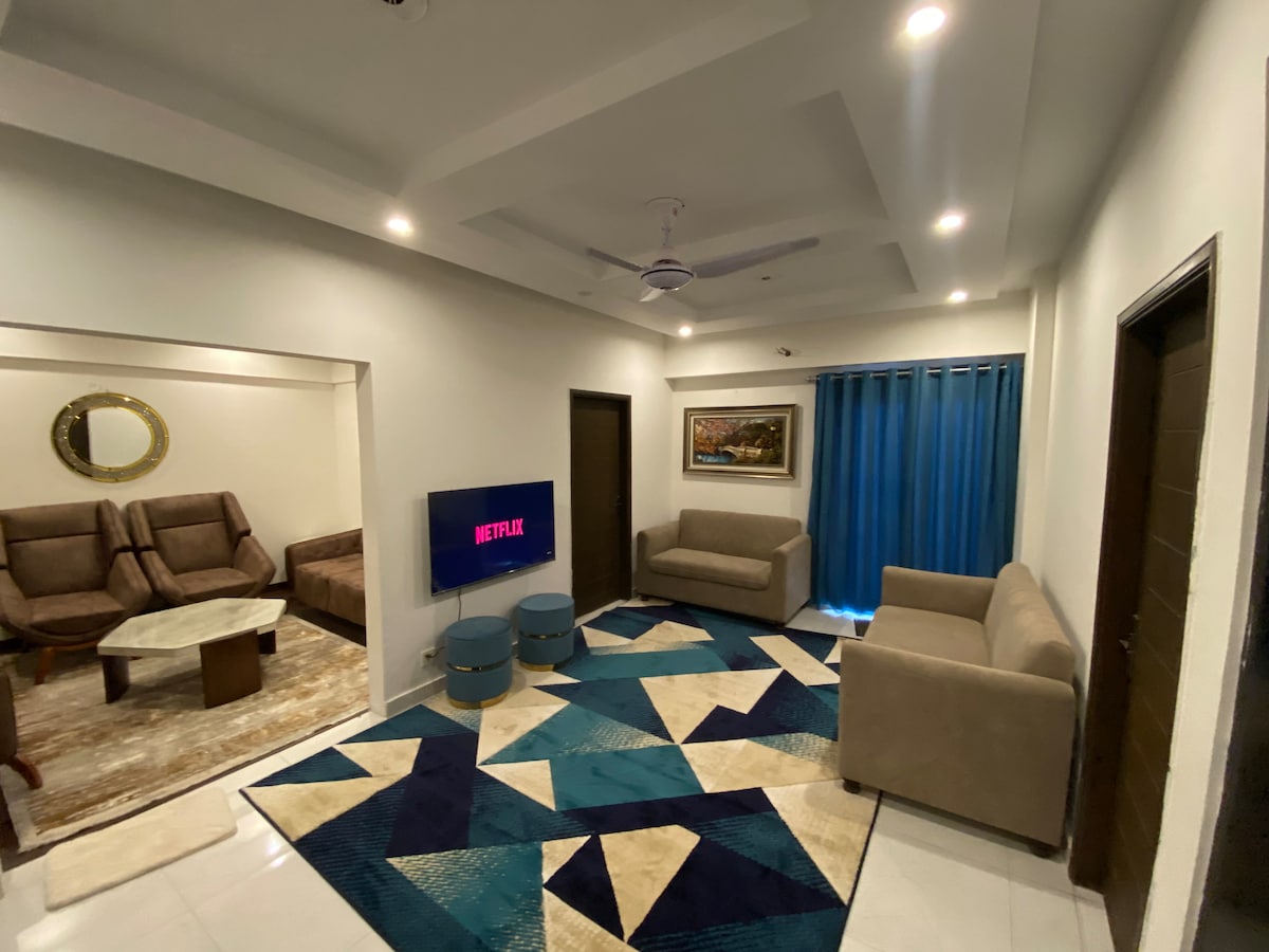 Bem-vindo ao nosso apartamento de 3 quartos bem mobiliado, cada um com um banheiro anexo e ar condicionado. O apartamento também possui uma sala de estar aconchegante, lounge e cozinha totalmente equipada, tornando-o perfeito para famílias ou grupos. Com amplo espaço, acomoda confortavelmente até 5 hóspedes Localizado no coração da Fase 6 do DHA, Nishat Commercial, o apartamento fica a apenas 1,5 a 2 km do Sea View, proporcionando fácil acesso à praia Temos orgulho em oferecer a melhor hospitalidade aos nossos hóspedes