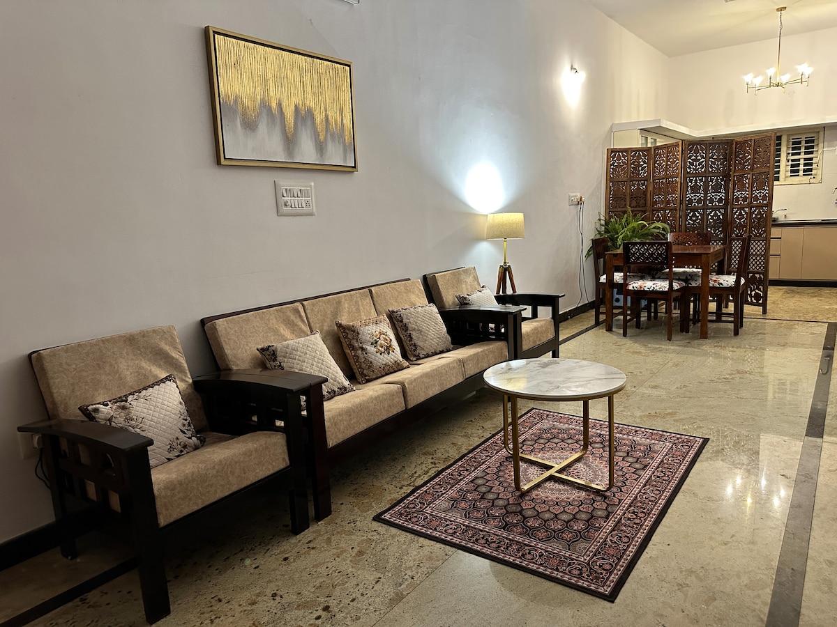 Nosso apartamento é arejado, estético e espaçoso. Você vai desfrutar de uma enorme sala de estar/jantar, 2 quartos, 2 banheiros, uma cozinha totalmente funcional e uma varanda com vista para o horizonte da cidade, abrindo-se para as colinas de Chamundi. No nosso terraço, você pode praticar ioga ou fazer uma xícara de chá e se preparar para assistir ao pôr do sol mais bonito. Estamos totalmente equipados para acomodar trabalhadores remotos, hóspedes de longa duração, famílias e viajantes corporativos, com todas as comodidades para uma estadia confortável.