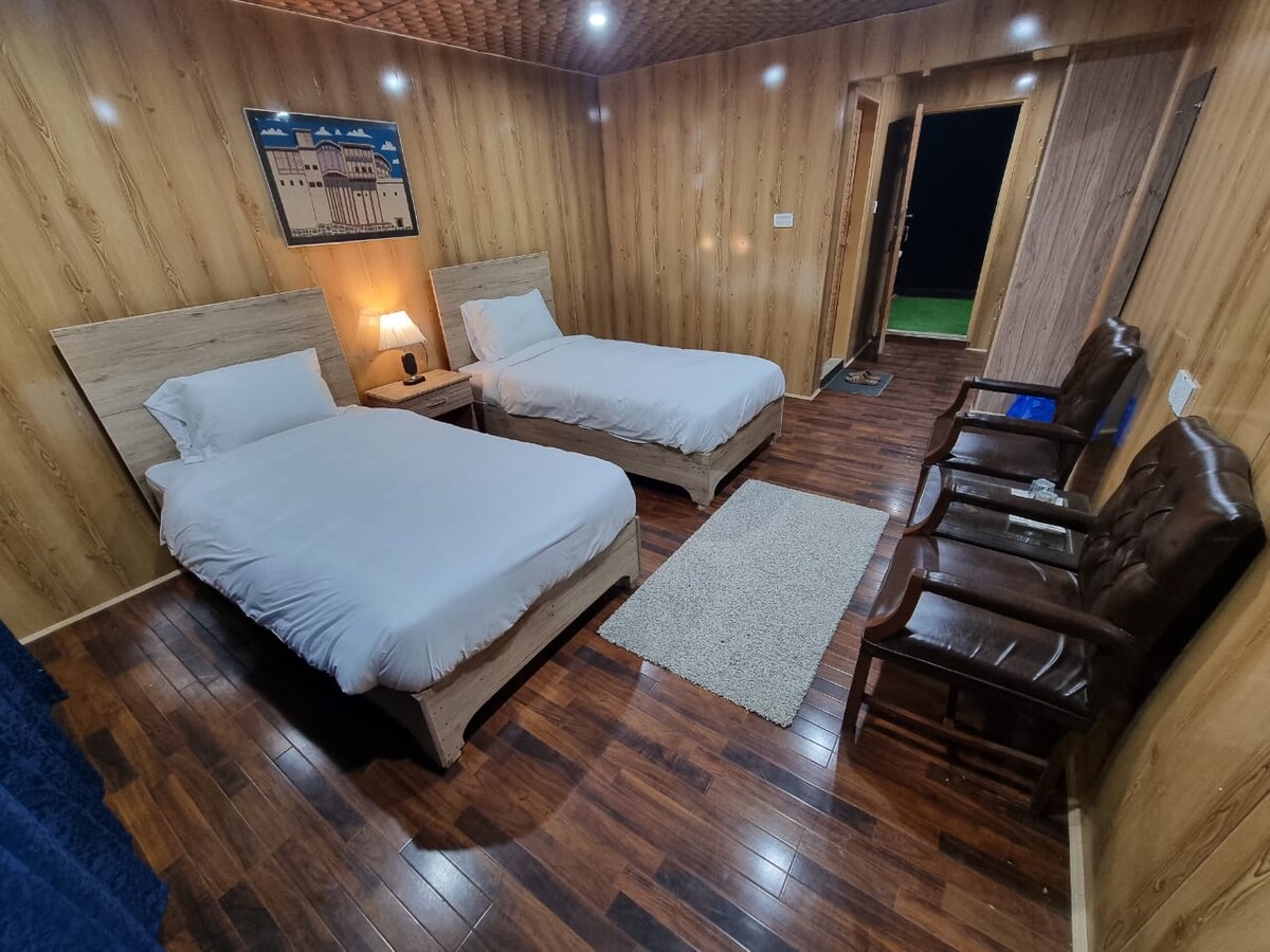 Este quarto tem duas camas com um banheiro compartilhado com um chuveiro tradicional com água quente e um banheiro indiano (banheiro de cócoras). Tem uma vista linda sobre o campo do pomar e está localizado na tradicional casa wakhi, por isso tem acesso a uma cozinha.