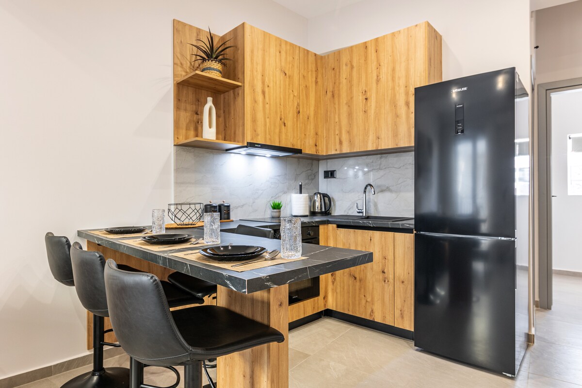 Um equilíbrio perfeito entre design de última geração e uma experiência aprimorada e agradável para os hóspedes. O apartamento está equipado com uma cama tamanho queen e uma área de estar confortável separada com um sofá de canto (que pode acomodar duas pessoas confortavelmente), bem como uma mesa de jantar que pode ser transformada em uma área de trabalho. A cozinha totalmente equipada oferece tudo o que você precisa para cozinhar em casa, enquanto o banheiro moderno cria uma atmosfera de bem-estar.