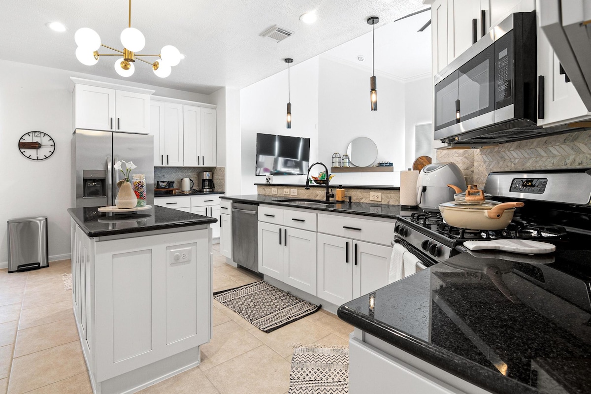 ✨ Casa espaçosa de 5 quartos + quarto extra | Acomoda 12-15 pessoas✨ Desfrute de conforto e conveniência nesta casa lindamente decorada com 2 suítes master com camas king, 3 quartos queen e quarto extra com colchões de ar. Área de estar moderna, cozinha de chef totalmente equipada e pátio externo de luxo com churrasqueira. Cortinas blackout, roupa de cama macia, Wi-Fi rápido, máquina de lavar/secar — tudo o que você precisa para uma estadia relaxante. Localizado perto das principais atrações, restaurantes e lojas.