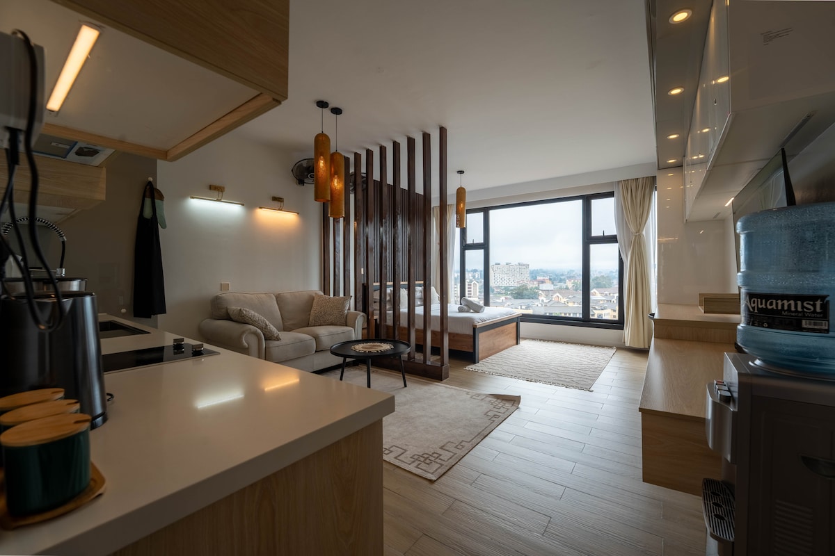 Descubra o seu santuário perfeito na cidade em nosso estúdio no 10º andar, idealmente localizado no tranquilo e seguro bairro de Lavington. Aqui, você pode desfrutar de vistas deslumbrantes e desobstruídas do pôr do sol. Apesar dessa tranquilidade, você está a apenas 8 minutos a pé do vibrante Junction Mall, colocando as melhores lojas e restaurantes ao seu alcance. Ideal para casais e aventureiros solitários, nosso santuário oferece um poderoso sistema de ar condicionado de 24.000 BTU para garantir seu conforto absoluto.