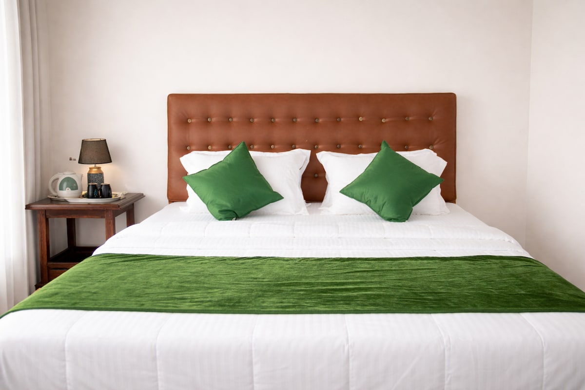 Casa de campo acolhedora localizada no meio do jardim de acomodações com vista verde. Esta casa de campo é feita de madeira de Mahogany. Tem uma cama de casal king size e sofá-cama também, então o máximo pode acomodar 3 pessoas. O tamanho do quarto do chalé é de 256 pés quadrados.