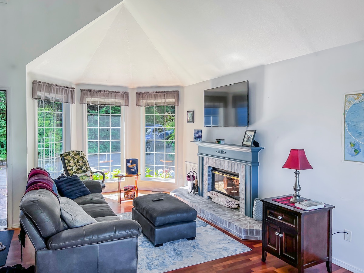 Esta suíte de estilo artesanal fará você se sentir como se estivesse a bordo de um navio, dormindo em uma cama confortável, olhando para o belo teto de madeira artesanal feito de cedro vermelho e amarelo local. As madeiras locais são apresentadas em toda a casa. Com acesso à praia do outro lado da rua na Praia Rotary (também conhecida como "Praia Bugge" para os moradores locais) e um belo caminho para caminhadas, você tem muitas atividades para preencher seu tempo. E se acontecer de ser um dia chuvoso, você tem uma varanda coberta para desfrutar do ar do mar!