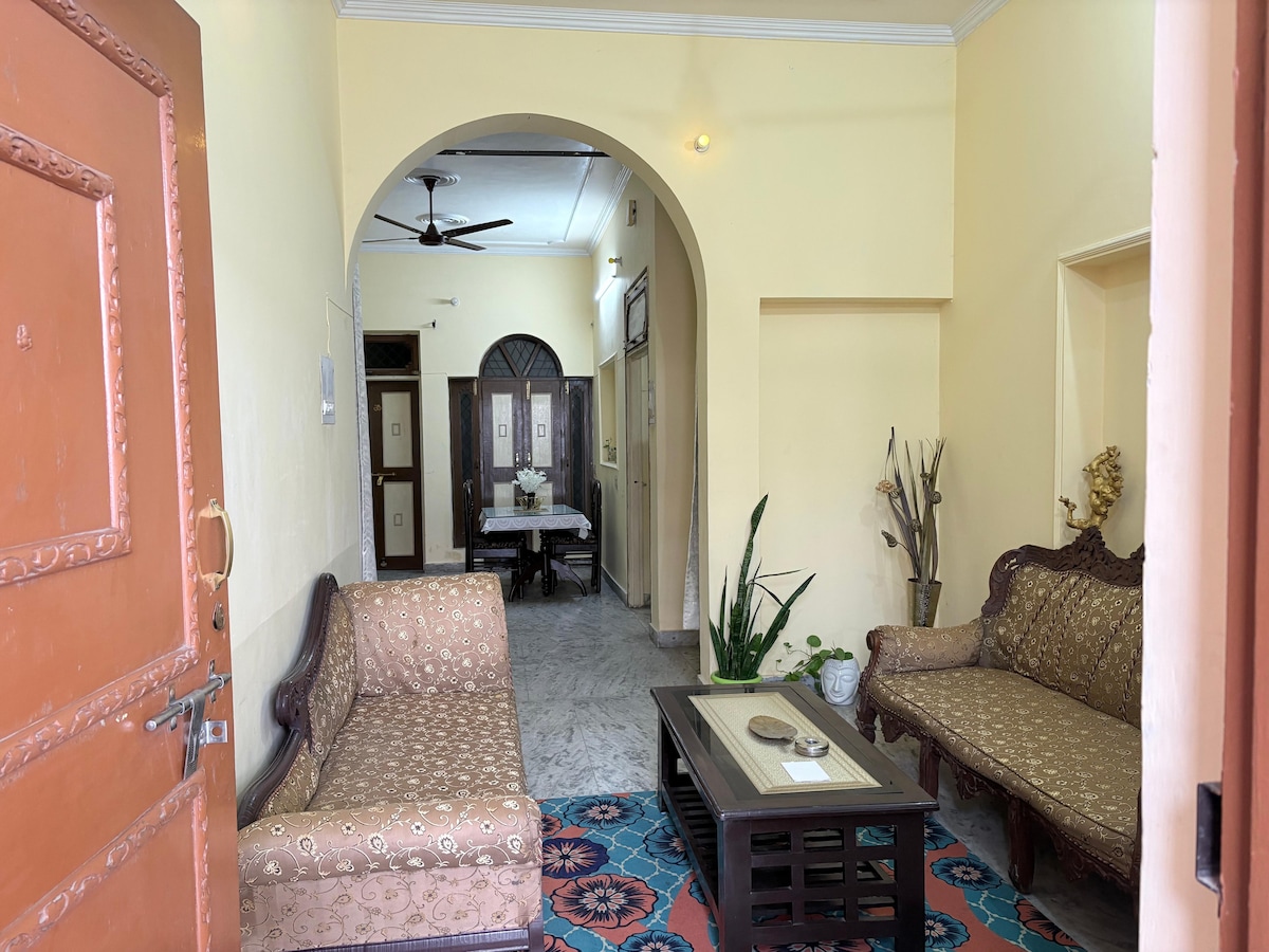 Bem-vindo à nossa aconchegante cobertura no segundo andar, com entrada privativa e um pátio encantador. A casa oferece 2 quartos com ar condicionado, cada um com uma cama king, 2 banheiros (um anexo, um na sala de estar), uma cozinha com filtro de água RO e uma pequena área comum com uma geladeira. Wi-Fi Airtel de alta velocidade e uma mesa de trabalho também são fornecidos. Observação: se reservar para 1 ou 2 hóspedes, 1 quarto e banheiro permanecerão fechados para uma experiência mais personalizada.