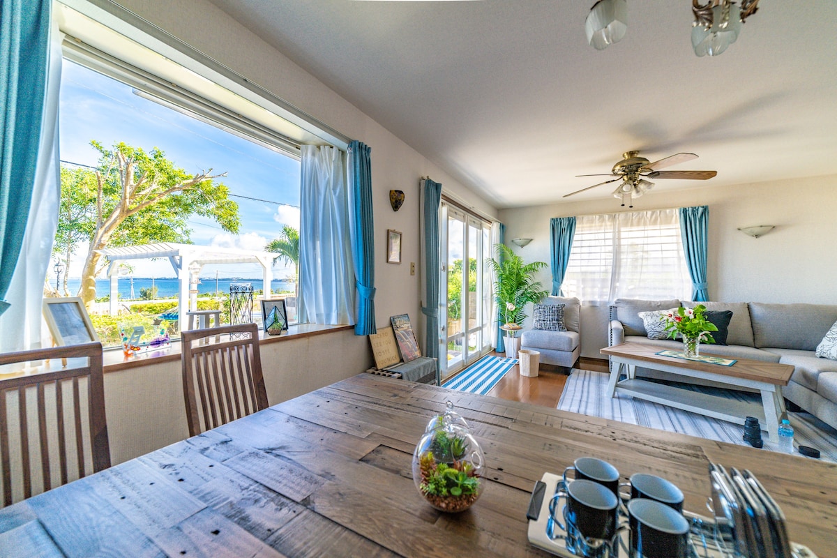 A propriedade fica a 45 minutos de carro do aeroporto, e o mar é tão perto que você pode ver as ondas da sala de estar.É um ambiente muito tranquilo. Está convenientemente localizado a 7 minutos a pé ou a 1 minuto de carro da loja Lawson Uruma Ishikawa Higashi Onna. 4 quartos, 6 camas, 2 banheiros Ideal para passeios perto da entrada da rodovia. A propriedade é uma casa 4LDK.Não há partes compartilhadas com outros hóspedes. Tudo será usado por 1 grupo, para que a privacidade seja protegida. Berços e cadeiras de criança são fornecidos. Há também um futon no quarto de estilo japonês, para que você possa descansar tranquilo, mesmo com crianças pequenas. Temos um conjunto de churrasco disponível gratuitamente. Lavadora e secadora também são gratuitas.Há também uma mesa de trabalho, então trabalhar não é problema. A TV na sala de estar tem aplicativos de vídeo como Netflix, Amazon, YouTube, etc. Você pode usá-lo convenientemente para estadias de longa duração, trabalho remoto, etc. Desfrute de Okinawa em um espaço privado com vista para o mar!