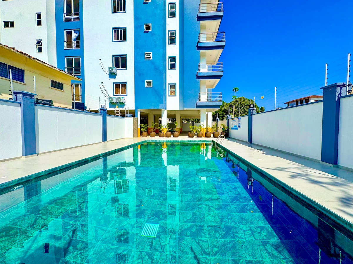 Localizado nos limites de Mombaça, nas areias prateadas da Praia de Bamburi. Meu apartamento ( Estúdio) é uma unidade em um Complexo de Apartamentos 5 estrelas com uma piscina externa e um terraço virado para o oceano. A unidade fica no 3º andar acessível por um elevador e escada. É auto-suficiente e vem com ar condicionado, uma TV de tela plana, varanda, cozinha compacta totalmente equipada, etc. Restaurante 5* no local, bar e academia Ideal para casais, aventuras individuais, viajantes de negócios e famílias (crianças).